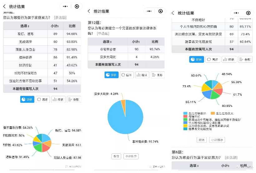 根据调查问卷数据显示:有多数人认为家暴原因是因为施暴者个人问题和心理扭曲,有95.74%的人认为健全反家暴法律体系非常有必要。有多数人对家暴的认识较为全面,但是请注意,下列行为都属于家暴噢。