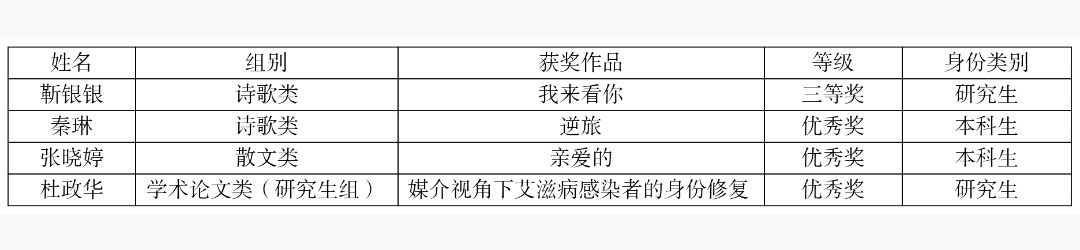 评选结果显示,公司学子共获得四项奖项。其中,公司研究生靳银银诗歌类作品《我来看你》荣获三等奖,本科生秦琳诗歌类作品《逆旅》、本科生张晓婷散文类作品《亲爱的》、研究生杜政华学术论文类作品《媒介视角下艾滋病感染者的身份复修》荣获优秀奖。
