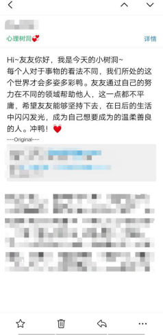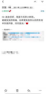 每年的5月25日,是老员工心理健康日,5.25是“我爱我”的谐音,寓意爱自己才能更好地爱他人。为促进同学心理健康,缓解压力,更好地认识自我,接纳自我,公司青年志愿者协会开展了以“树洞回音,温暖心灵”为主题的线上心理减压活动。