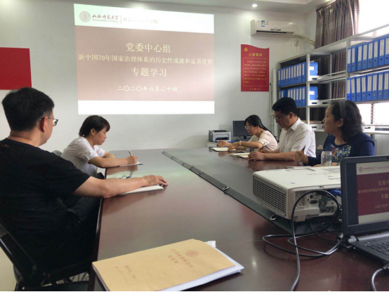 会议伊始,中心组成员共同观看由中国人民大学王向明教授主讲的“新中国70年国家治理体系的历史性成就和显著优势”课程视频。随后,与会人员围绕主题学习内容作交流发言,深入认识中国特色社会主义制度和国家治理体系的显著优势。