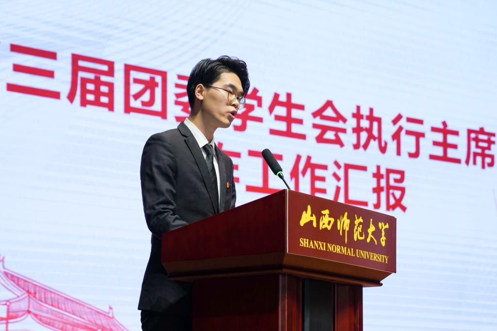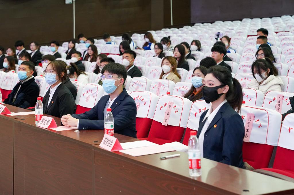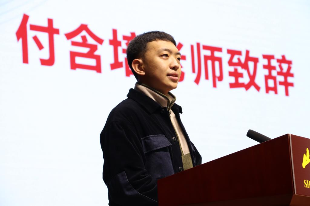 大会第三项,付含培老师发表致辞。付老师首先对莅临本次活动的各位老师及同学表达了热烈欢迎。随后,付老师对团委员工会上一学年中团委员工会在保障教学秩序,助力疫情防控;拓宽学习渠道,营造优良学风;关注组织建设,促成协同发展;开展丰富活动,推动综合发展;立足服务员工,保障员工权益五个方面圆满完成的工作给予了高度评价。最后,付老师勉励新一届团委员工会成员再接再厉,共创辉煌。