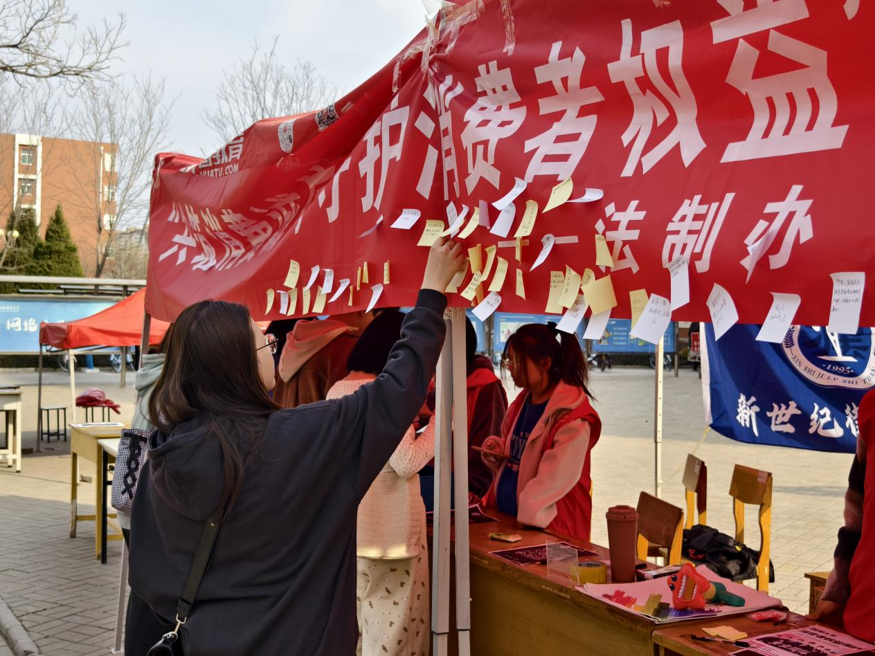 为了加强师生消费者权益保护意识,3月15日,球盟会新世纪律师团在思政文化街6号教学楼前举办“共筑消费诚信,守护消费者权益”315活动。本次活动除大一大二员工志愿者参与组织之外,还特别邀请了职业律师,提高了广大师生的活动积极性。
