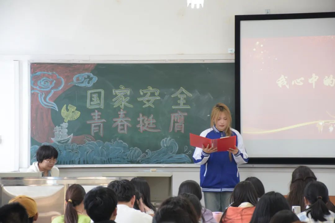 随后,郝天芷同学上台分享了她对于国家安全的理解,她用精炼的语言,清晰而坚定地表明了自己维护国家安全的决心和信心。会议最后,主持人带领参会人员宣读国家安全教育誓词,同学们目光坚毅,铿锵有力的声音展示出青年一代对于维护国家安全的坚定信念。