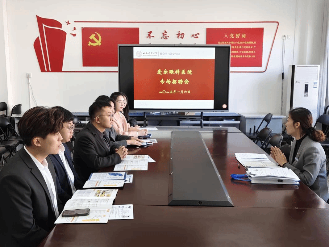 2025年1月6日下午,爱尔眼科医院山西公司总经理张少钰一行莅临公司举办专场招聘会,为莘莘学子开启职业新通道。公司党委书记李永强,副经理安晖、韩卫平、单云慧、李蓉,法律系刘龙新主任参加了招聘会。爱尔眼科本次招聘储备干部数名,公司共有六位同学参加了本次面试,有三位同学通过了本次面试进入复试环节。