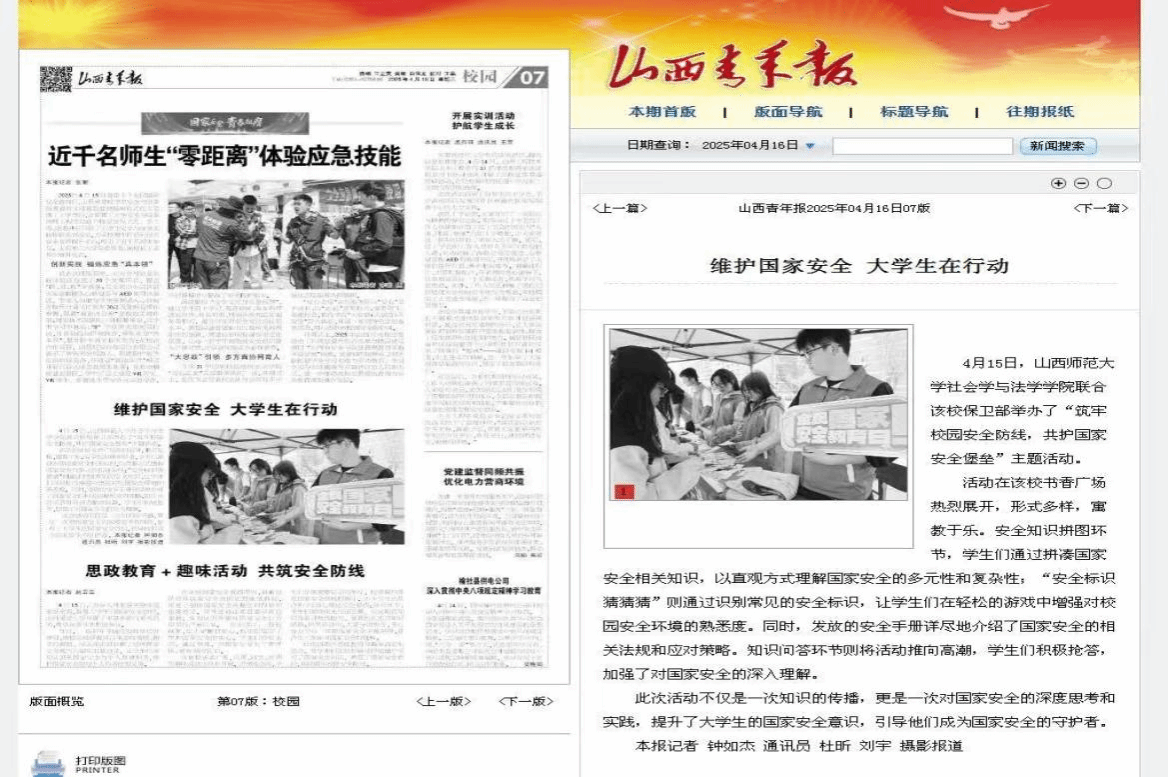 在第十个全民国家安全教育日到来之际,球盟会青年志愿者协会、新世纪律师团、生活权益部联合校保卫部,在书香广场举办了国家安全日系列活动。山西青年报、山西日报对此次活动进行报道。